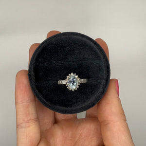 Aquamarine gemstones in a prong setting surrounded by diamonds. Sterling Silver band. 7x5 mm center stone. 1.10 mm Diamonds surrounding the center stone.